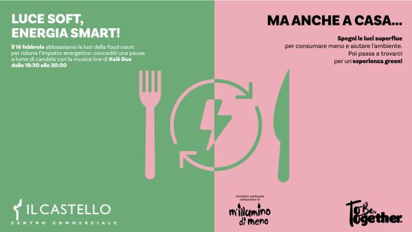 Il 16 febbraio, abbasseremo le luci della food court per ridurre l’impatto energetico e creare un’atmosfera più intima e accogliente. Vi invitiamo a concedervi una pausa a lume di candela, accompagnata dalla musica live di Kalè Duo, dalle 18:30 alle 20:30.