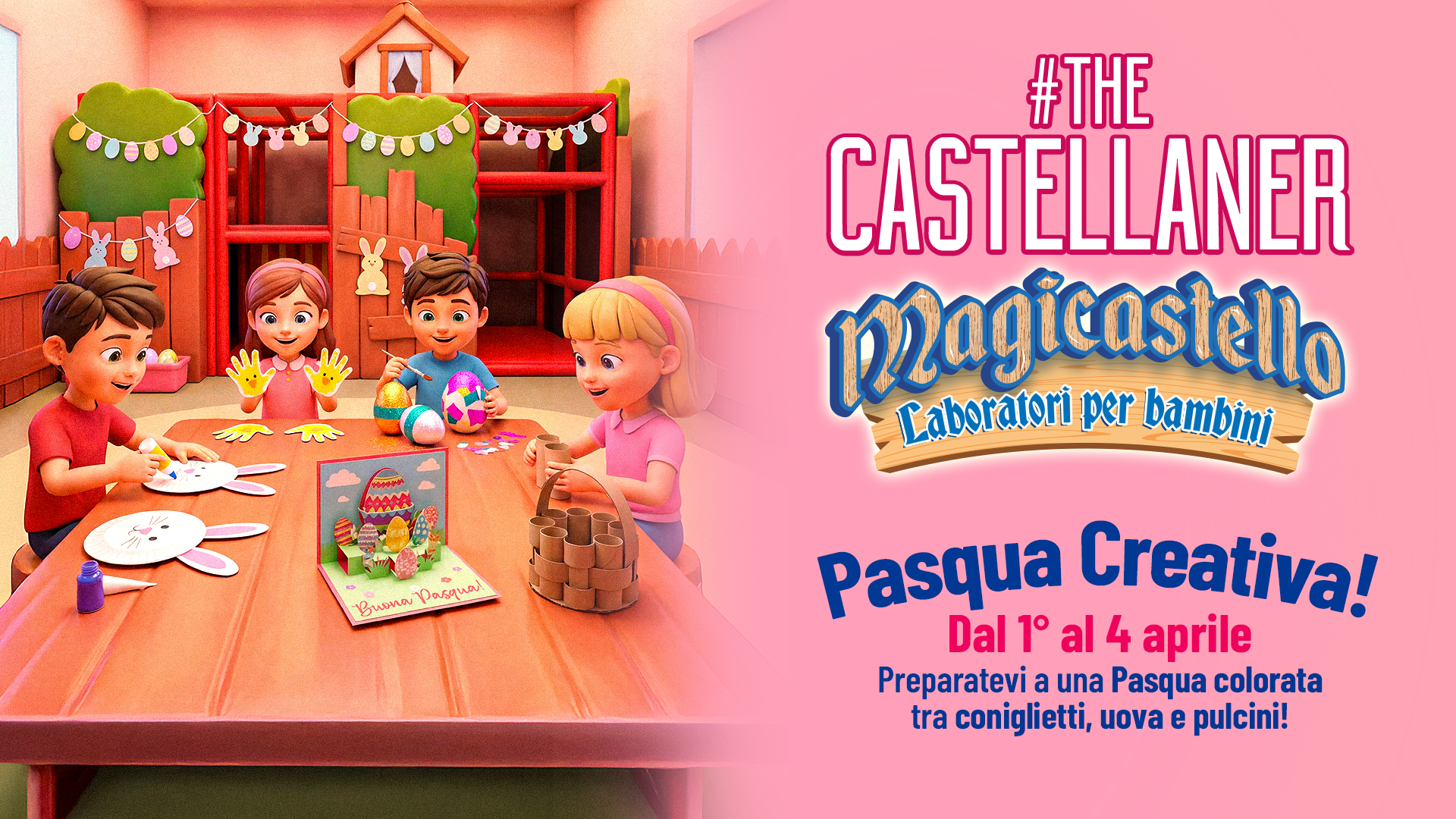 Sei pronto a vivere una Pasqua piena di colori, fantasia e divertimento? Al Magicastello la festa è già iniziata! Dal 1° al 4 aprile, aspettiamo tutti i piccoli artisti per i nostri laboratori dedicati alla Pasqua: tra coniglietti, uova decorate e simpatici pulcini, la creatività non ha limiti!